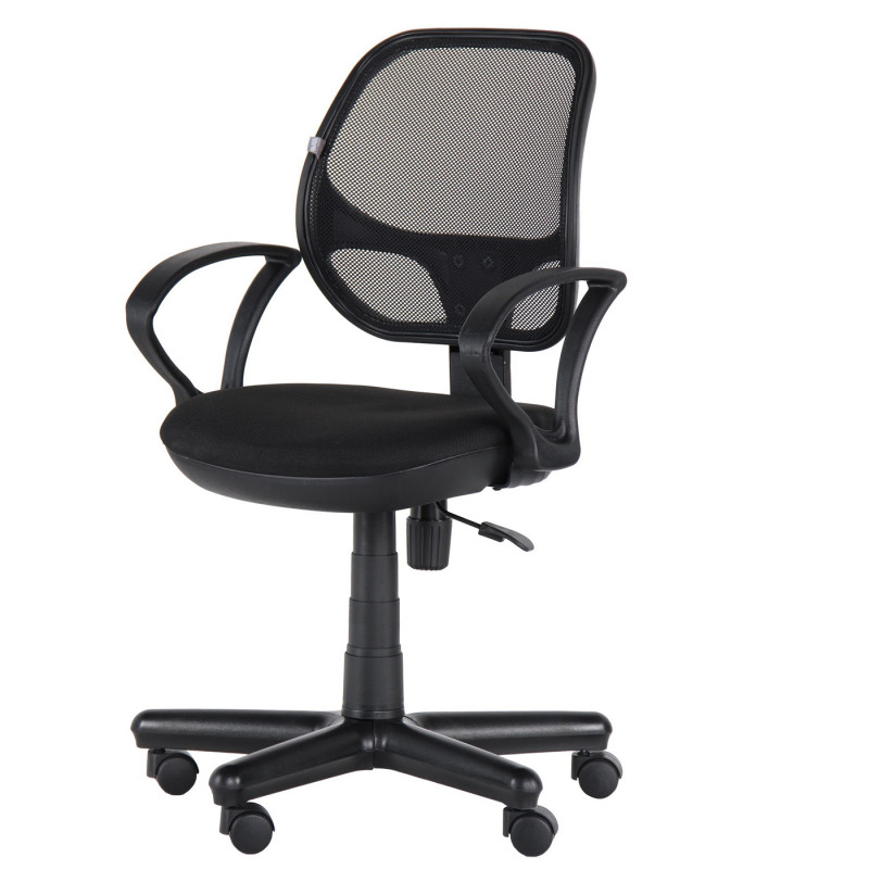 Спинка кресла выполнена из прочной тканевой сетки, обеспечивающей вентиляцию и комфорт при длительной работе.