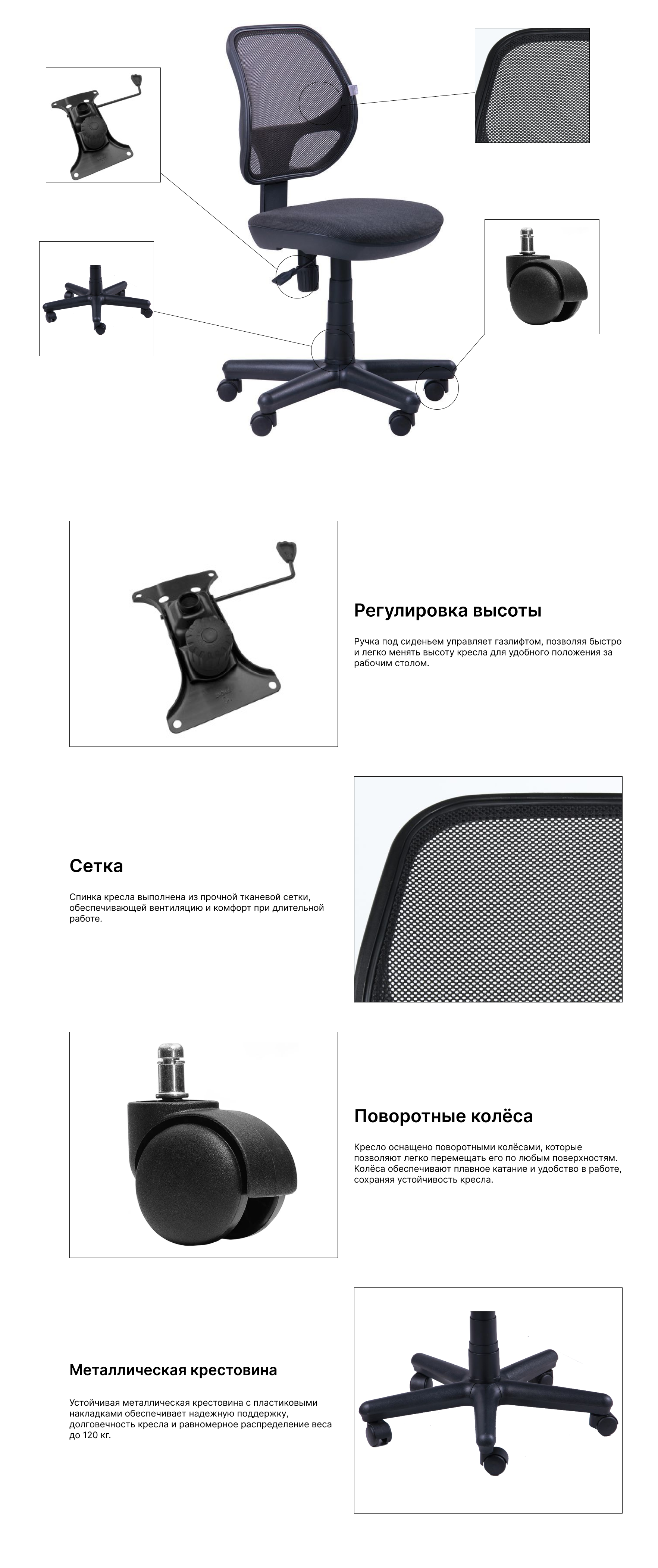 Габариты кресла (Ш×Г×В): 650×650×870–1000 мм. Вес: 6,4 кг.