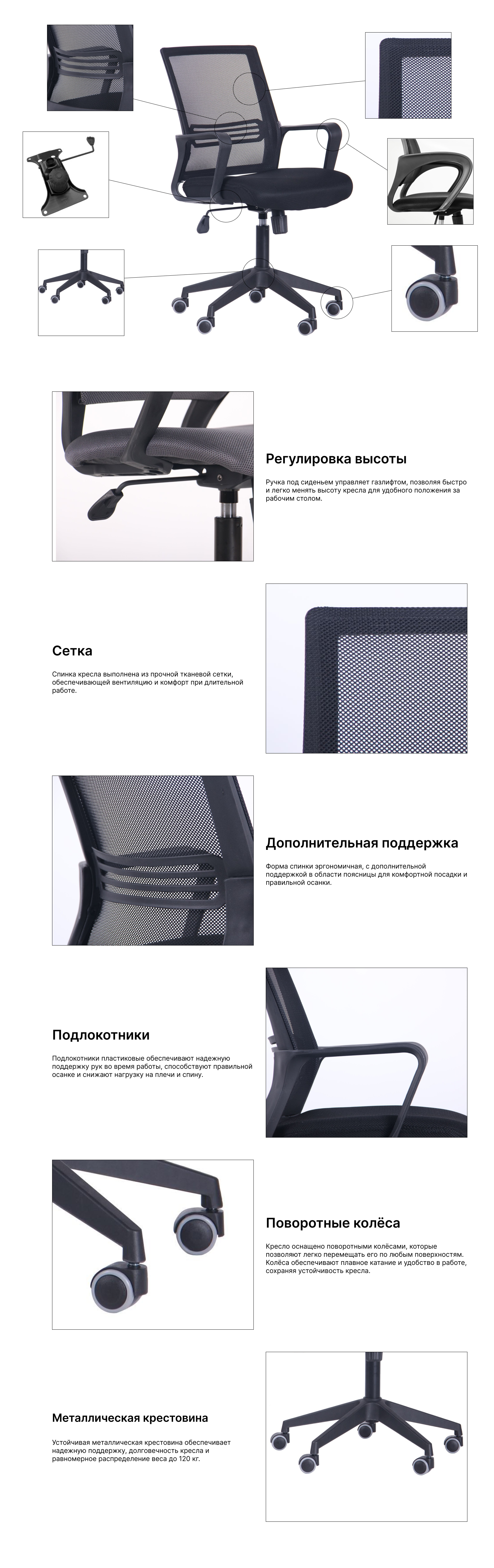 Габариты кресла (Ш×Г×В): 570×640×920–990 мм. Вес: 10,8 кг.