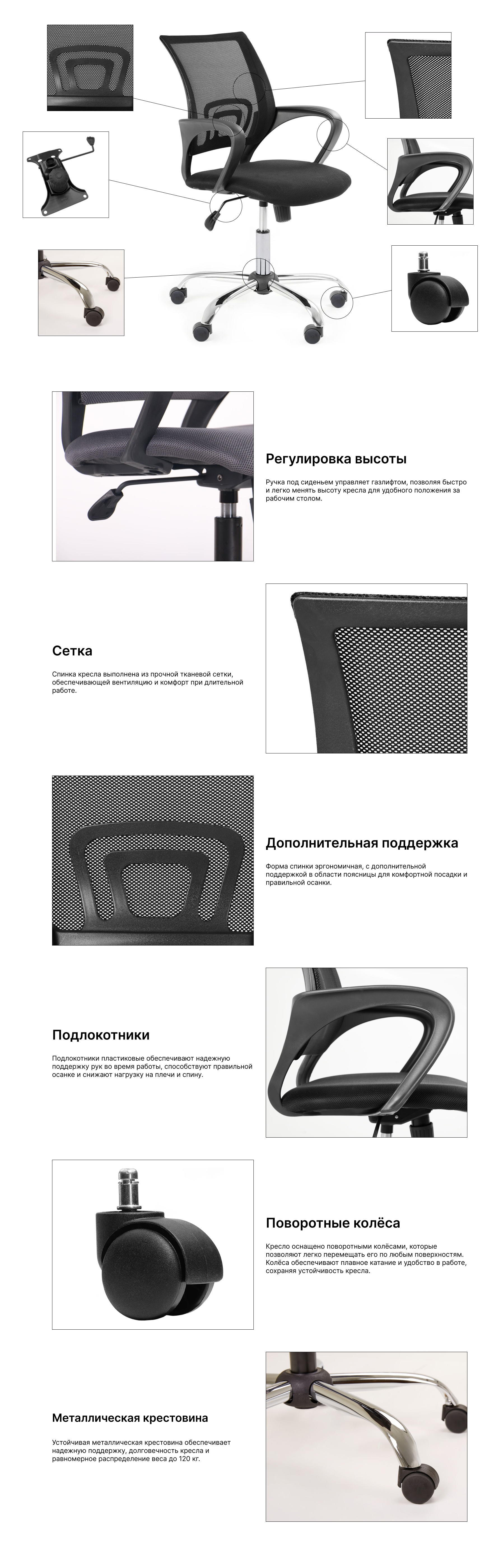- Спинка кресла выполнена из прочной тканевой сетки, обеспечивающей вентиляцию и комфорт при длительной работе.