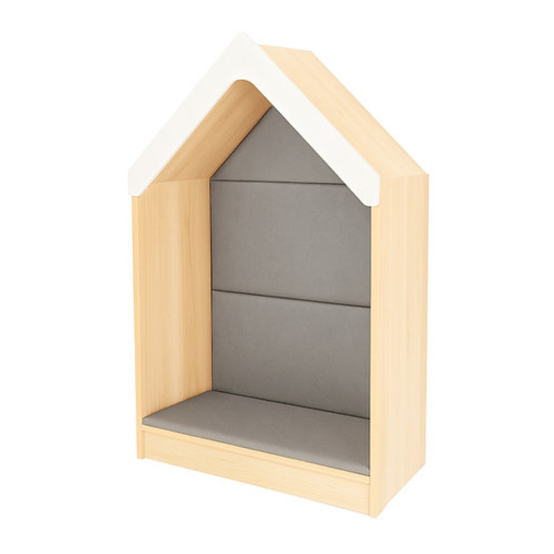 - В нижней части расположена скамья обитая тканью серого цвета встроена в каркас домика.