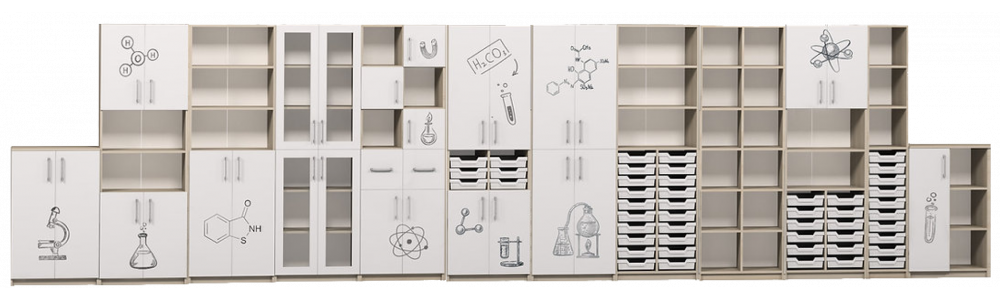 Шкафы и стенки для хранения учебных материалов и химической посуды — пробирки, колбы, реактивы, учебники и тетради. Доступны модели с открытыми, закрытыми и полузакрытыми отделениями, а также шкафы с лотками для безопасного хранения мелких предметов.