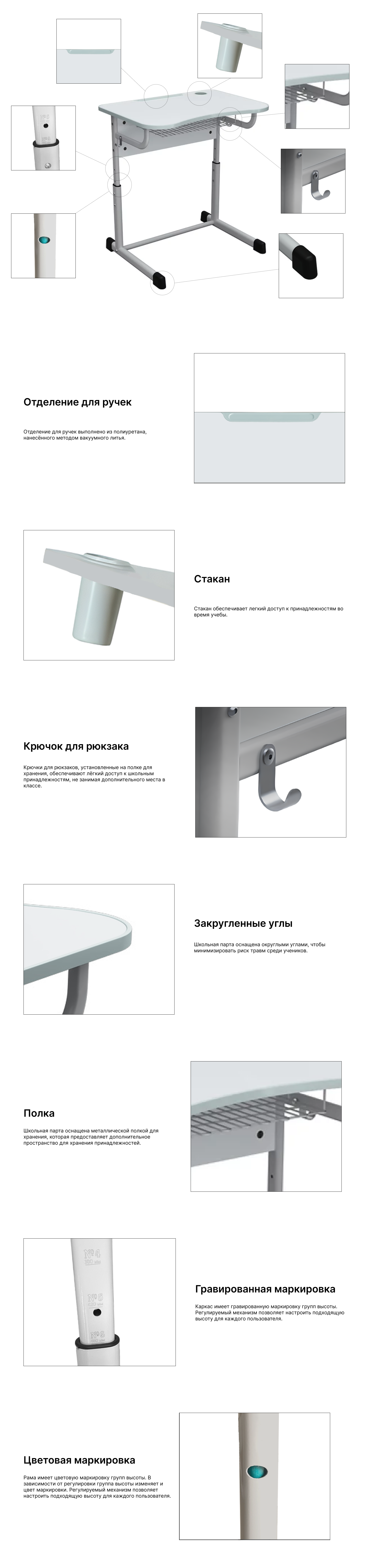 - Столешница парты оснащена специальным вырезом со стороны ученика, для сохранения правильной осанки при обучении.