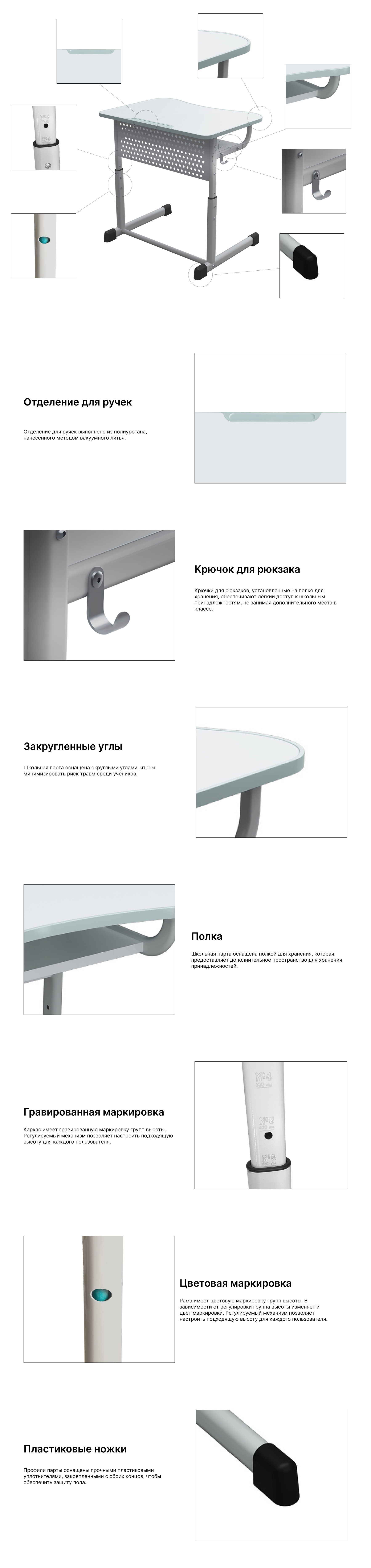 - Столешница парты со скругленными углами, что делает парту безопасной при использовании.