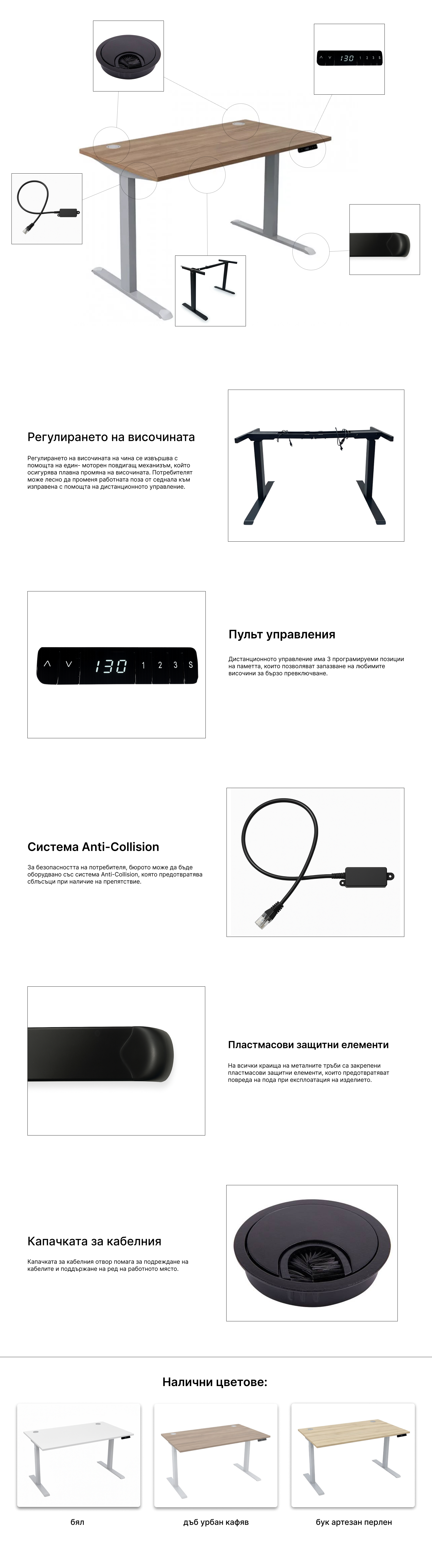 - За безопасността на потребителя бюрото може да бъде оборудвано със система Anti-Collision, която предотвратява сблъсък при препятствие.