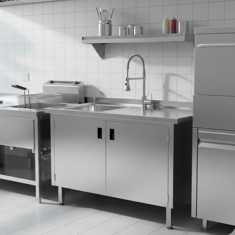 - În partea superioară sunt amplasate chiuveta și blatul, iar în partea inferioară este prevăzut un spațiu închis pentru depozitare, ascuns de două uși.