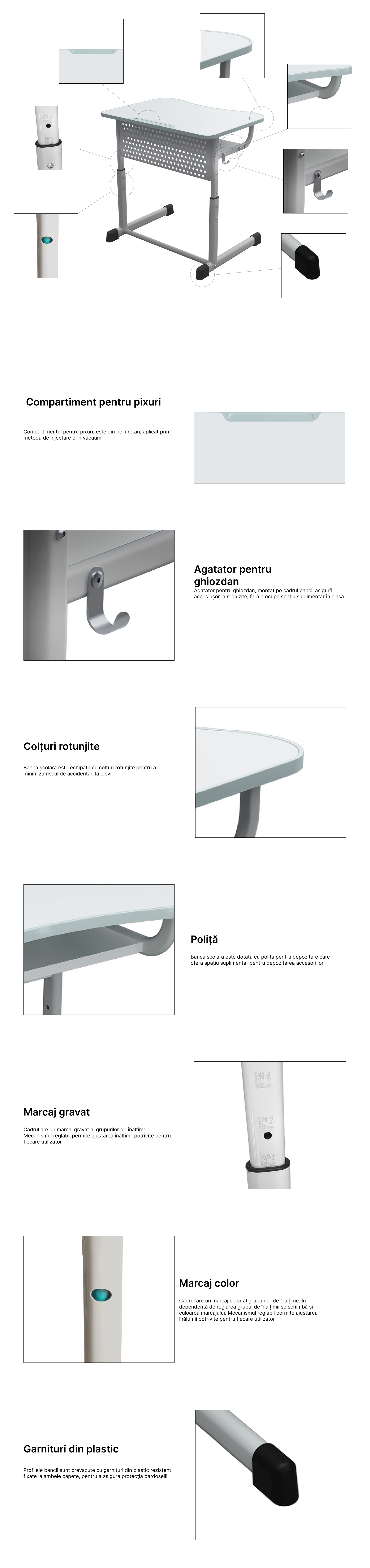 - Banca scolara este dotata cu o polita pentru depozitare si cu un agatator de ghiozdan.