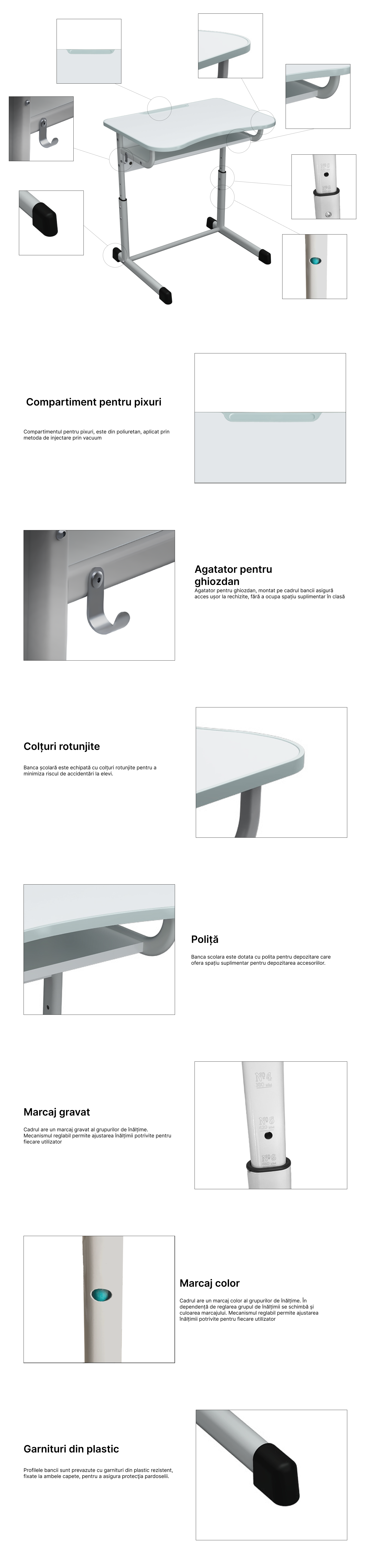 - Banca scolara este dotata cu o polita pentru depozitare si cu un agatator de ghiozdan.