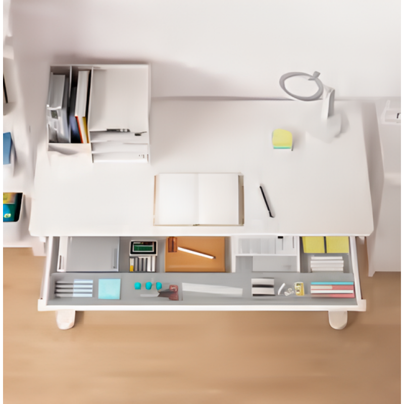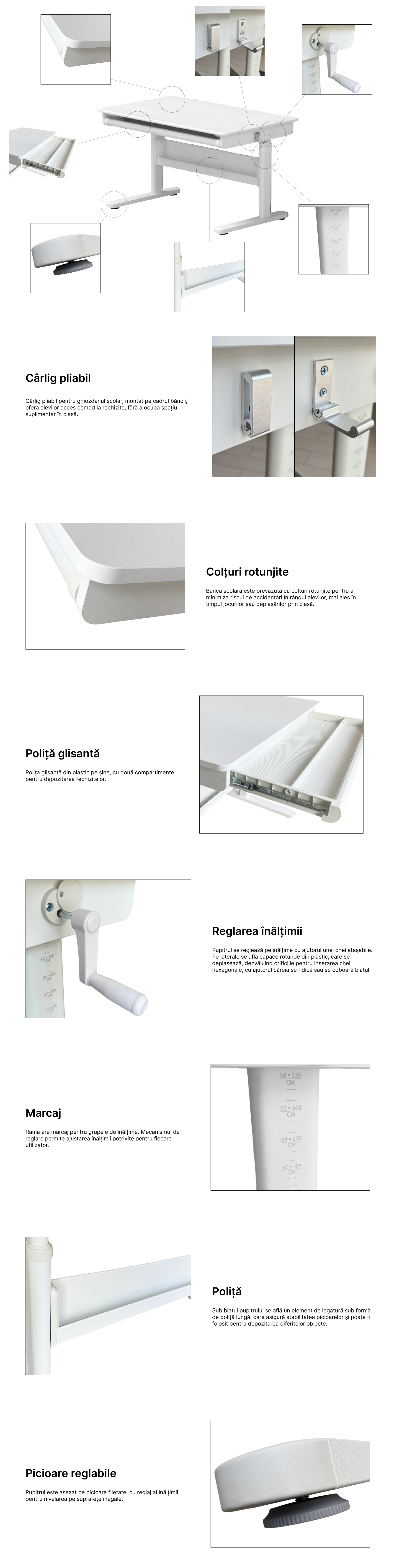 - Sub blat se află un sertar glisant pentru depozitarea ușoară a rechizitelor și materialelor de studiu.