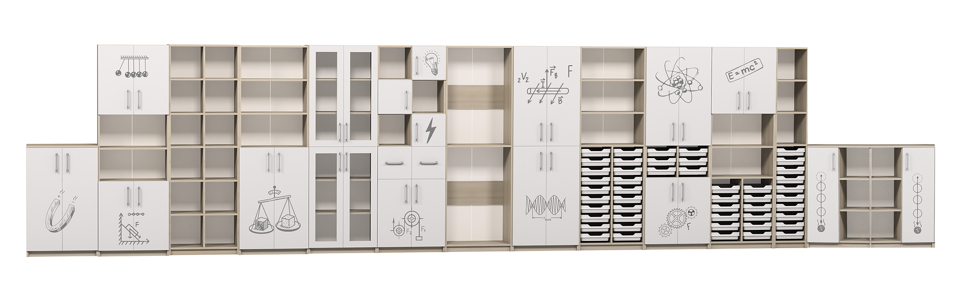- Fațadele dulapurilor sunt decorate cu imprimare foto cu tematică fizică.