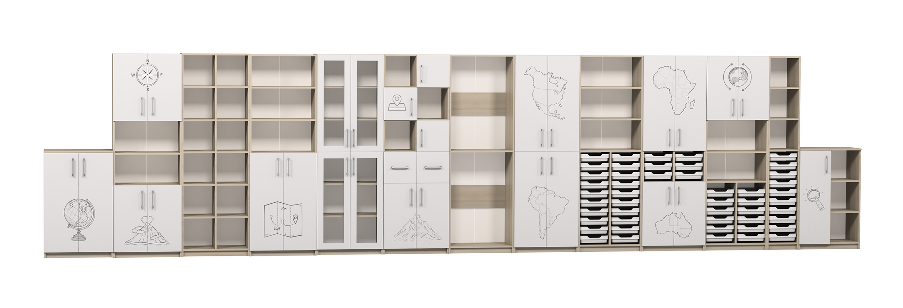 - Fațadele dulapurilor sunt decorate cu imprimare foto cu tematică geografică.