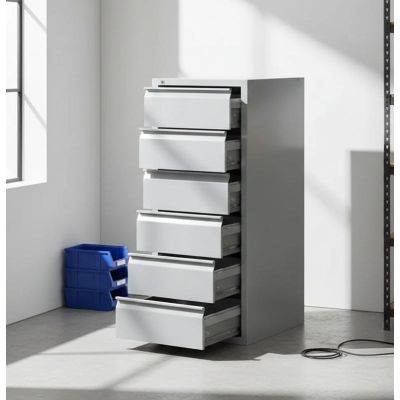 - Dispozitiv anti-răsturnare: Dulapul este echipat cu un dispozitiv de siguranță care împiedică deschiderea simultană a mai mult de un sertar, prevenind astfel răsturnarea dulapului.