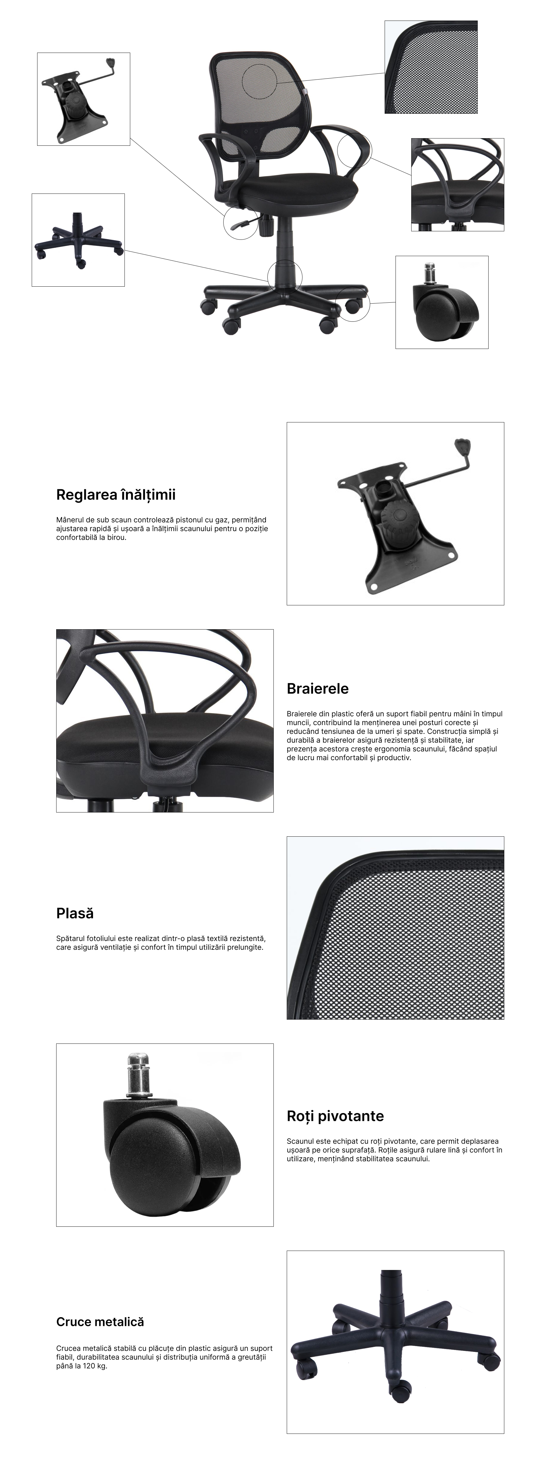 - Bază metalică cu elemente din plastic, diametru – 640 mm, stabilă și durabilă.