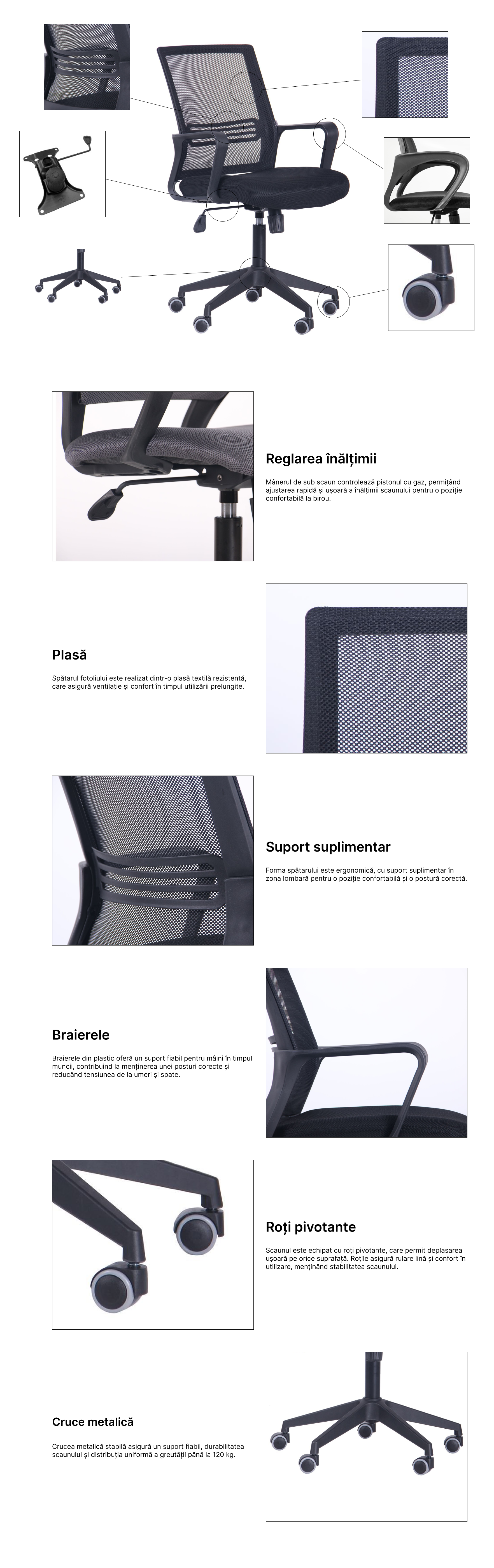 - Spătarul fotoliului este realizat dintr-o plasă textilă rezistentă, care asigură ventilație și confort în timpul utilizării prelungite.