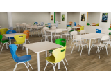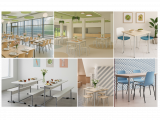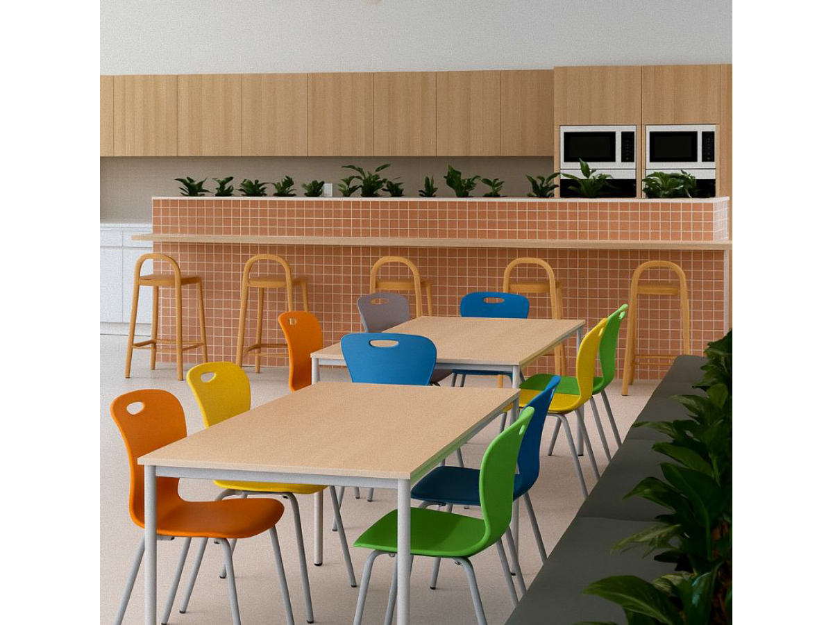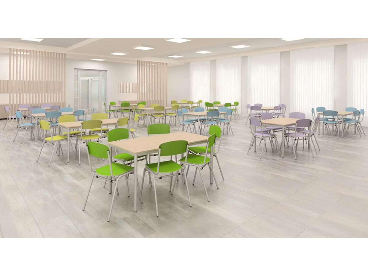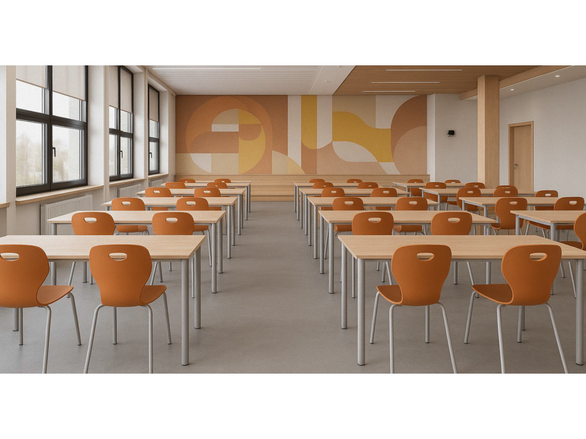 Dispunerea flexibilă a meselor — Mesele sunt plasate strategic pentru a permite un flux liber și o interacțiune ușoară între elevi. Formele simple și linii clare contribuie la un design aerisit, care nu îngreunează spațiul.
