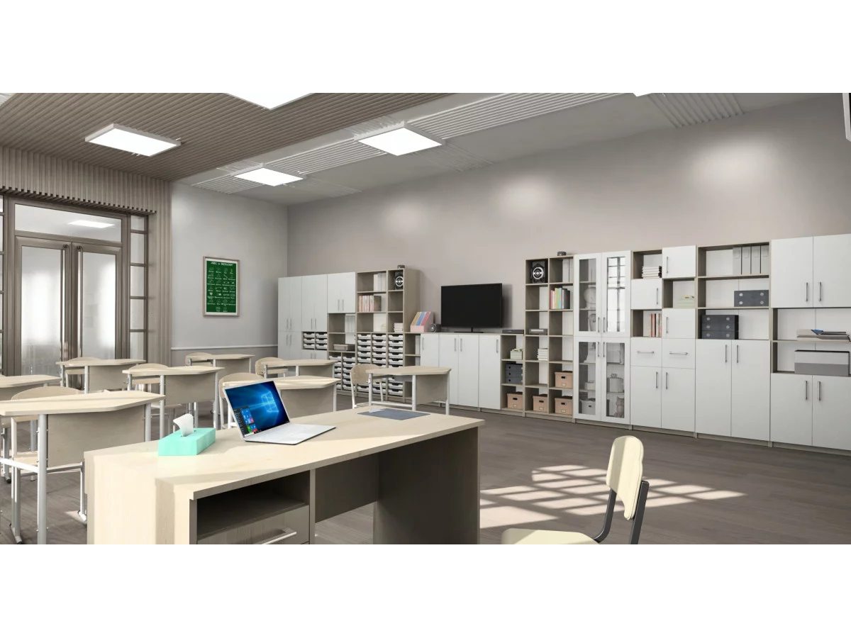 Biroul profesorului — practic și minimalist, echipat cu sertare pentru depozitare, ceea ce permite organizarea eficientă a spațiului de lucru al profesorului și concentrare pe desfășurarea lecțiilor.
