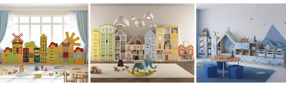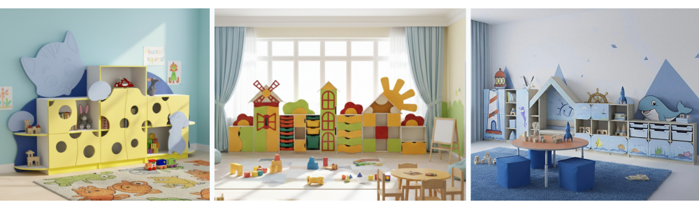 В нашем шоуруме представлены самые разные модели стенок для детского сада – разной формы, размеров, дизайна. Самыми актуальными и популярными считаются детские стенки, выполненные в необычном дизайне, привлекающие внимание детей. В ассортименте есть изделия с элементами водостойкой фотопечати с изображениями Бабочек, Домика в деревне. Также рекомендуем обратить внимание на модели детских стенок с уникальным, красочным МДФ декором в виде Сказочного поезда, Мельницы, Домика, Башни, Замка. Стенки с МДФ накладками позволяют оформить игровую комнату в детском саду в разном тематическом стиле. В нашем шоуруме представлены и более классические модели детских стеночек, акцент которых – яркая цветовая гамма фасада.
