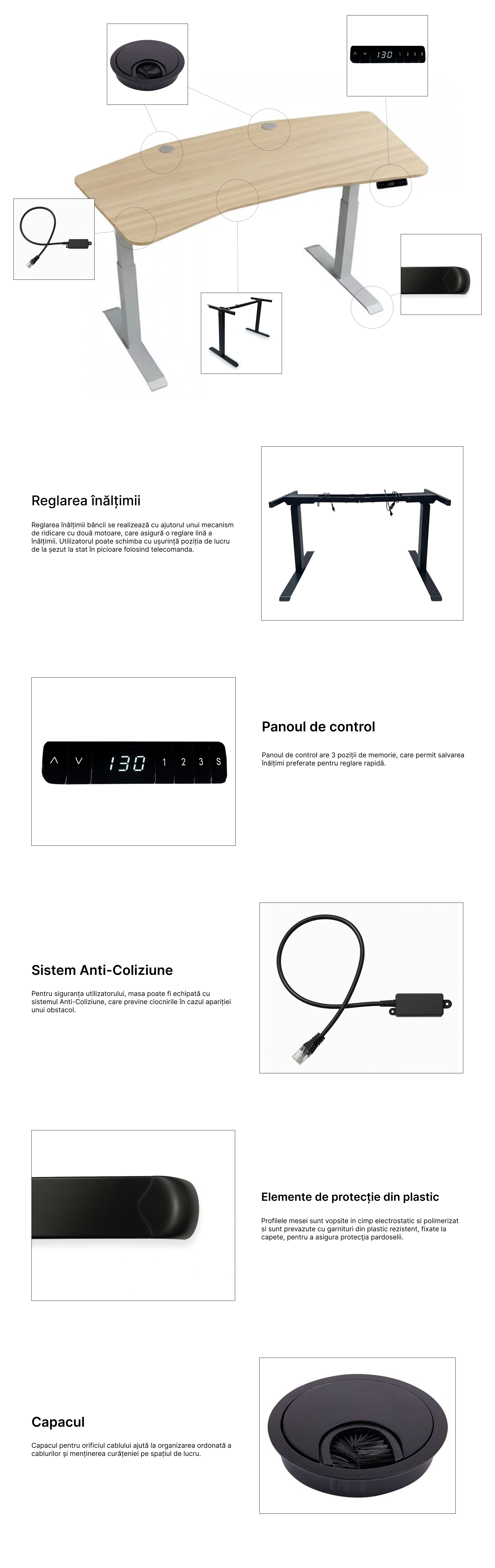 - Reglarea înălțimii se realizează printr-un mecanism cu două motoare, care asigură o reglare lină a înălțimii.