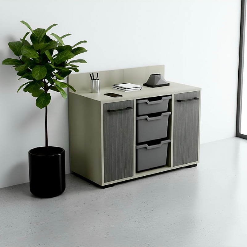 - Dulapul este prevazut cu rafturi inchise si cu 5 cutii de depozitare cu ghidaje din plastic