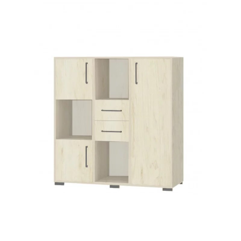 - Dulapul are trei uși, trei rafturi deschise și două sertare pe șine cu extensie completă.