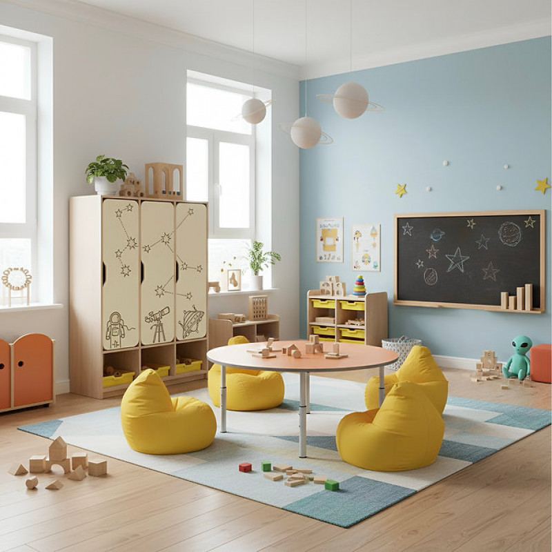 - Usile dulapului sunt decorate cu imprimare foto- imagine cu stele, telescop, astronaut.