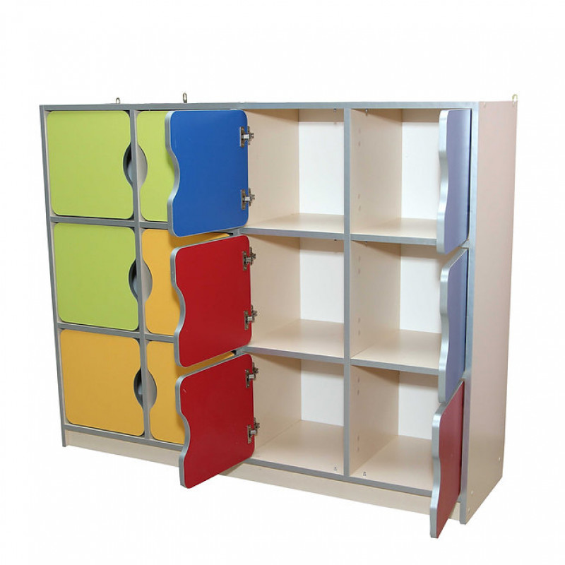 - Dulapul contine 12 rafturi cu usi colorate cu colturi rotunjite si sunt prevazute cu un loc special pentru deschidere.