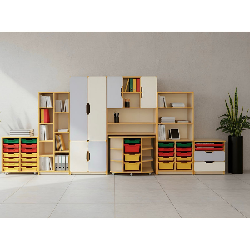 - 1 compartiment este prevazut cu 14 cutii de depozitare din plastic, asamblat pe 4 roti pivotante.