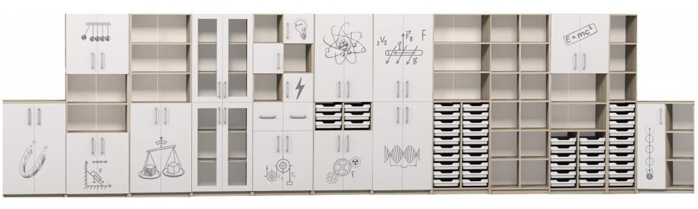Dulapuri și panouri pentru depozitarea materialelor didactice — manuale, echipamente de laborator, modele și materiale auxiliare. Sunt disponibile dulapuri închise, deschise și semi-închise, precum și dulapuri cu sertare și rafturi pentru depozitarea comodă a obiectelor mici.