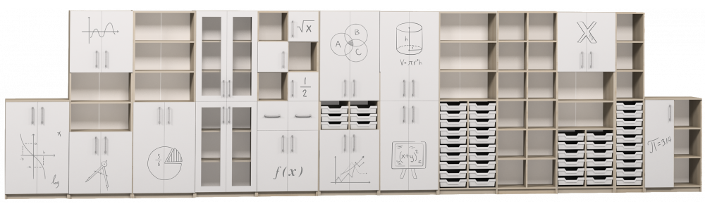 Dulapuri și seturi de mobilă pentru depozitarea caietelor, manualelor, dosarelor și altor materiale necesare la ore. Sunt disponibile modele cu Imprimarea foto pe tematică matematică: formule, figuri geometrice și grafice — un design care face sala mai interesantă și contribuie la crearea unei atmosfere educaționale.
