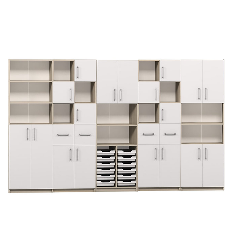 - 2 - Dulap combinat cu cinci uși. Dulapul are 5 rafturi închise, 3 rafturi deschise și 2 sertare pe ghidaje telescopice cu extragere completă. Este prevăzută reglarea înălțimii unui raft.