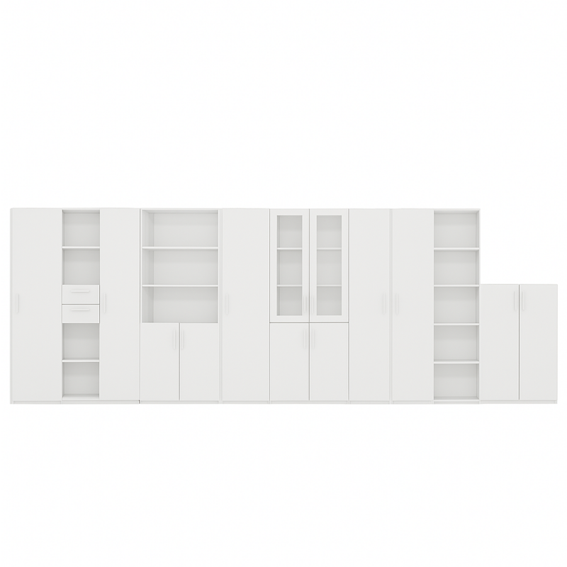 Setul de dulapuri permite achiziționarea tuturor elementelor împreună și, dacă se dorește, schimbarea aranjamentului acestora.