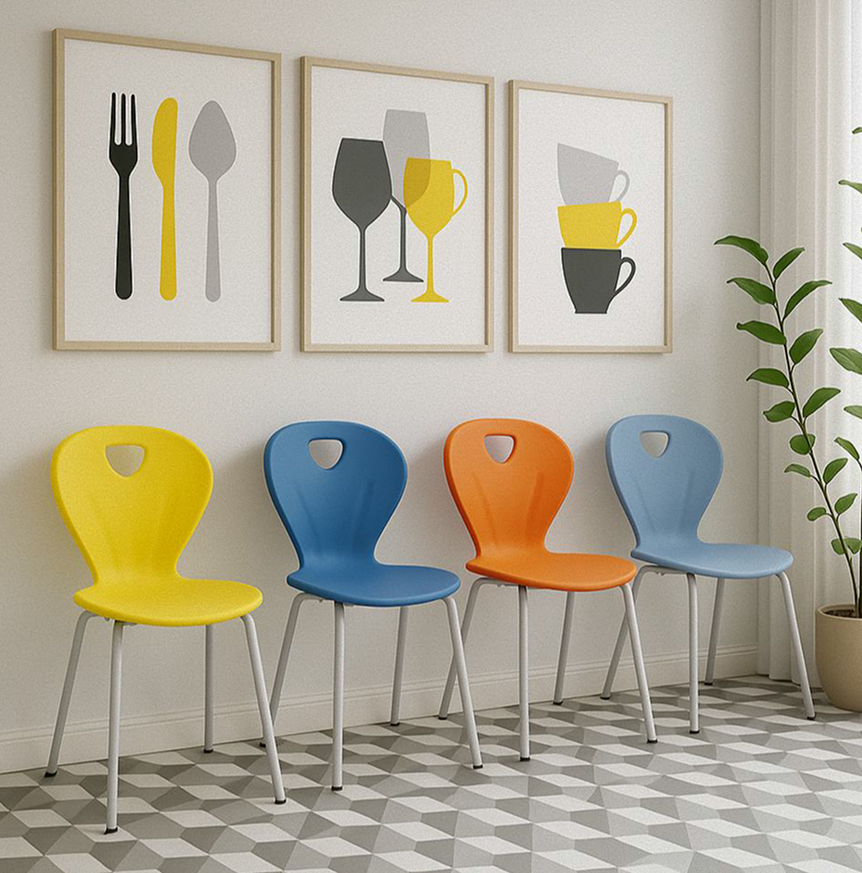 - Șezutul și spătarul scaunului sunt un bloc unic (monobloc), din plastic turnat solid, fabricat din polipropilenă de calitate.